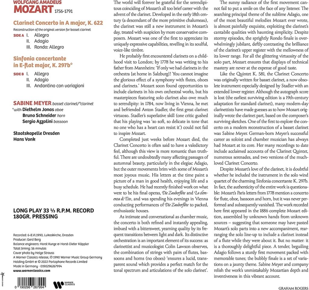 MOZART:CLARINET CONCERTO K.622/SINFONIA CONCERTANTE K.297b/SABINE MEYER iz kategorije lp sodi med odlične Nosilci zvoka in slike.