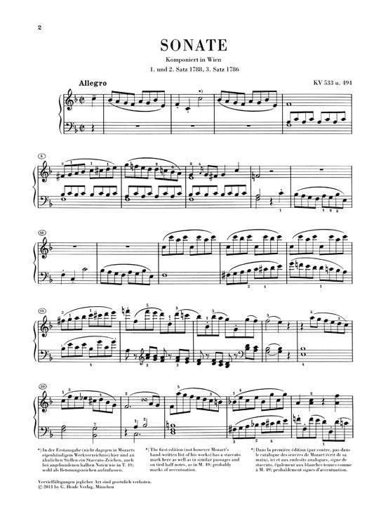 Mozart je sestavil to sonato iz dveh delov, ki sta bila sestavljena v različnih časih. Rondo K. 494 je iz leta 1786. Šele januarja 1788 je Mozart sestavil dva dela K. 533 in Hoffmeistru na Dunaju objavil tri stavke kot sonato. V ta namen pa je Rondo temeljito predelal in vključil majhen odlomek, podoben fugi - morda zato, da bi finale približal ostalim dvema stavkoma. V svoji končni različici delo prikazuje, kako intenzivno je Mozart takrat gledal v slog Bacha in Handela. Zdaj to sonato, ki je vključena v celoten zvezek, ponujamo kot privlačno posamezno izdajo z novim predgovorom urednika
