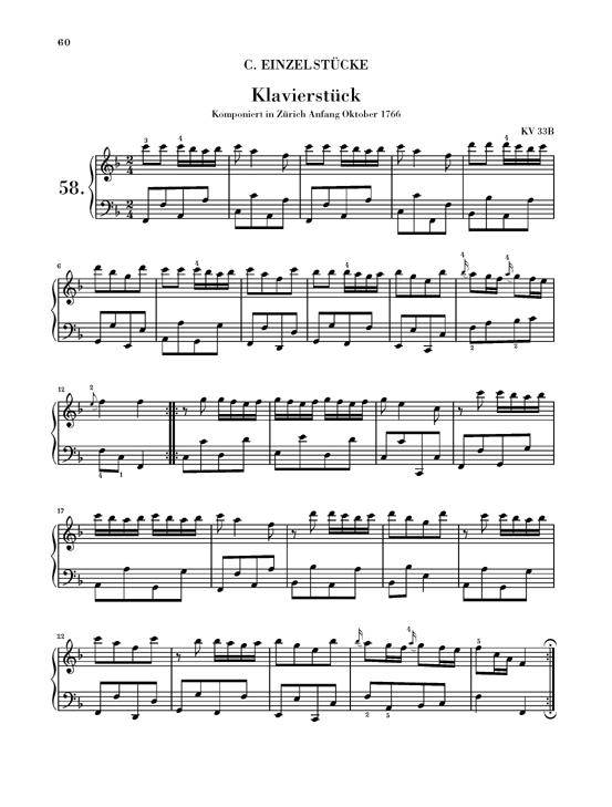Vse življenje je Mozart sestavljal posamezne skladbe za tipkovnico. To bogastvo materiala nam ponuja izjemen vpogled v njegov glasbeni razvoj. Prvič doslej vsa ta dela ponujamo v eni izdaji. Naša izdaja je bila v celoti popravljena ob upoštevanju najnovejših ugotovitev Mozartove štipendije. V mnogih primerih so temelj revizije viri, ki so bili na voljo šele pred kratkim ali so bili na novo interpretirani. To je privedlo tudi do vključitve del, ki jih ni bilo v prejšnji izdaji Henle.