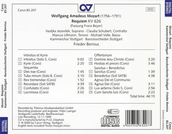 Frieder Bernius ponuja interpretacijo Mozartovega končnega dela na najvišji umetniški ravni. Posnel je različico Requiema iz leta 1981 Franza Beyerja, v kateri so dodatki Franza Xaverja Süssmayra ostali večinoma nedotaknjeni. Vendar pa je bila instrumentacija končnih gibov izboljšana.