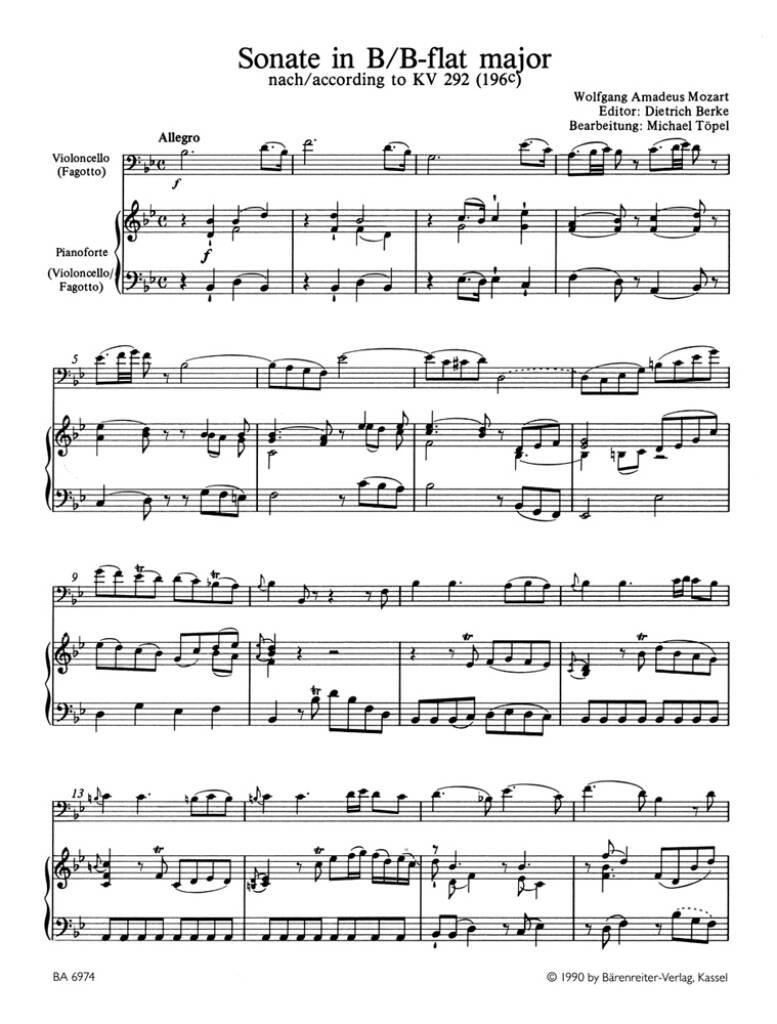 MOZART:SONATE IN B FOR CELLO (BASSOON) AND PIANO KV292 (196c) iz kategorije skladbe sodi med odlične čelo.