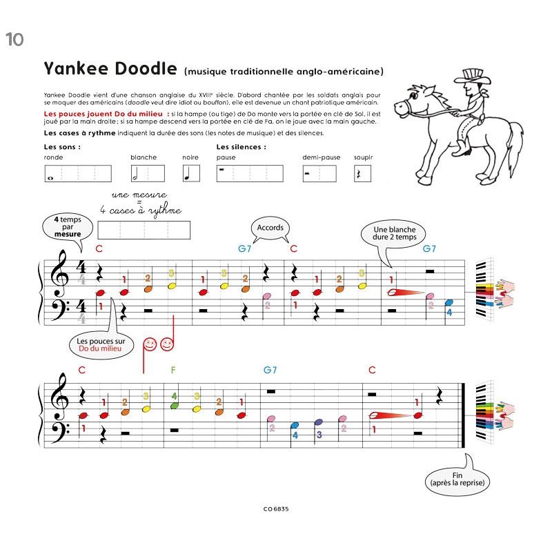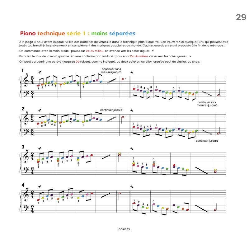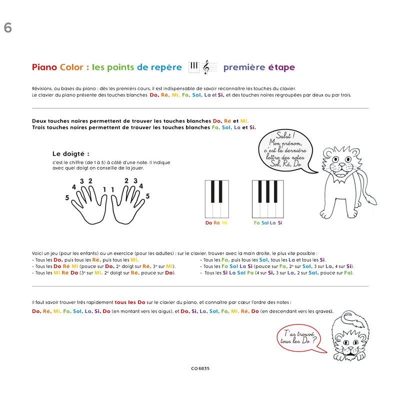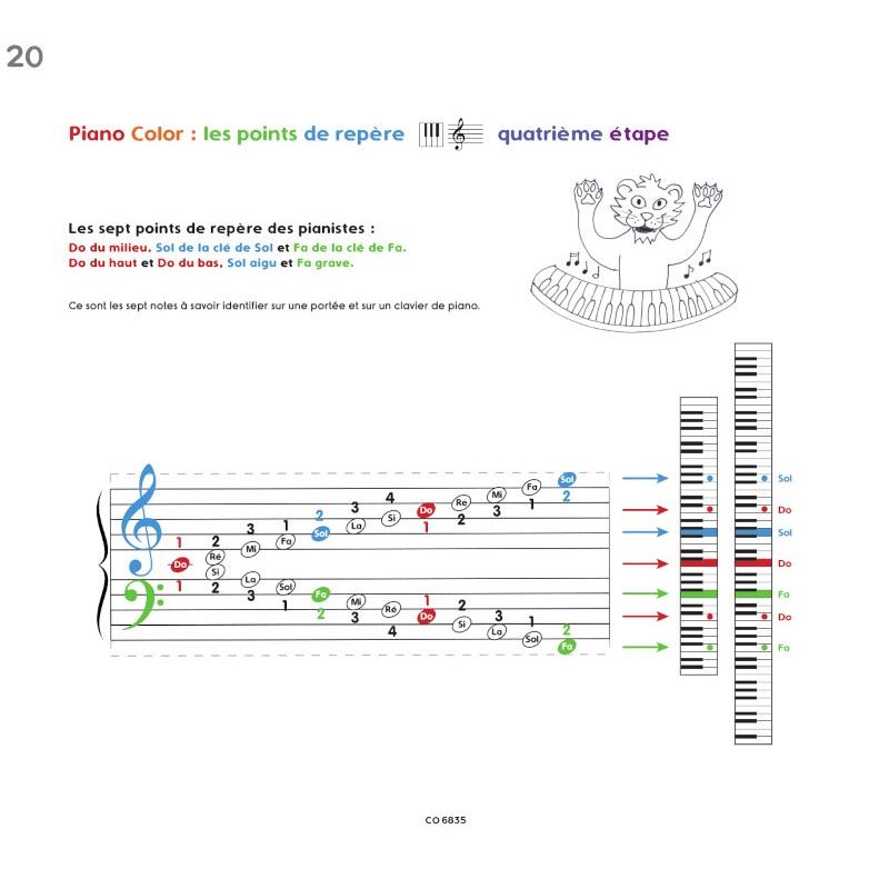 V nadaljevanju metode Rainbow Piano Method, Piano Color temelji na igrivi pedagogiki (glasbene note v velikem formatu in v barvah, večbarvne nalepke za lepljenje na klaviaturo za lažjo uporabo ...), vendar gre še dlje! To metodo lahko uporabite po študiju metode Rainbow Piano, lahko pa jo uporabljajo tudi začetniki v načinu "zabavnega klavirja". Ponuja znano in univerzalno tradicionalno glasbo: evropsko, ameriško, rusko, kitajsko itd., pa tudi vaje virtuoznosti.