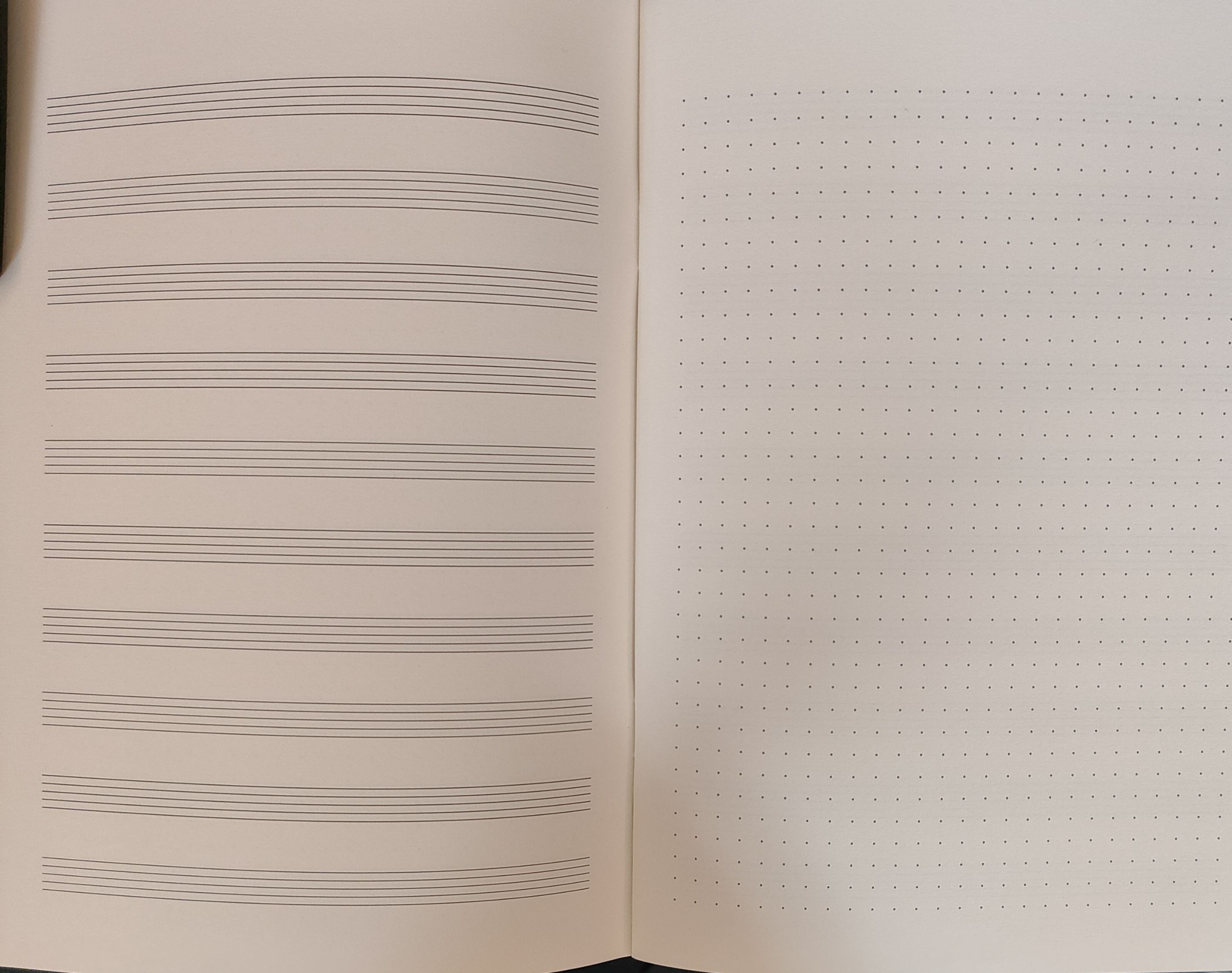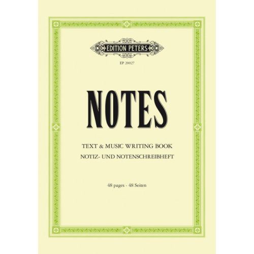 Opombe: Zvezek za pisanje besedil in glasbe iz izdaje Peters je idealen za vse študente glasbe, ki ga lahko uporabljajo kot zapiske pri učnih urah ali kot dnevnik vadbe, saj obsega 48 strani z 10 vrstnim sistemom in s 5 mm pikami krem barve papirja. Predstavljen v takoj prepoznavnem slogu naslovnice Edition Peters Green Series, je ta A5 zvezek z velikimi platnicami popoln spremljevalec glasbenikov in bo zagotovo koristen vsem, ki si želijo zapisovati glasbene note.
