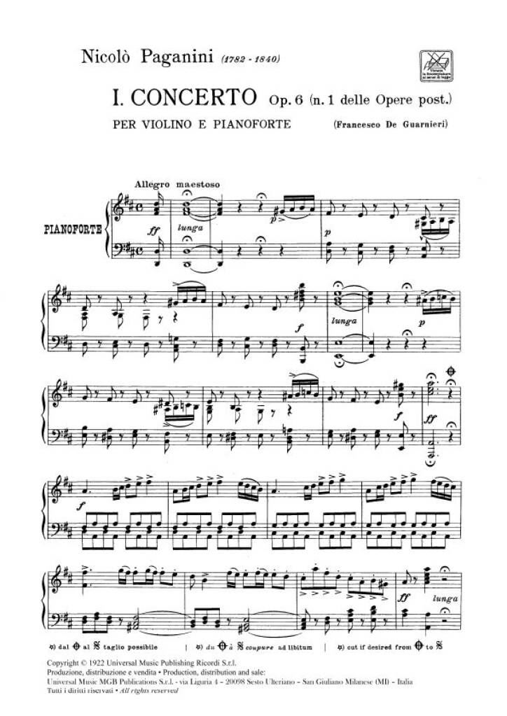 PAGANINI:VIOLIN CONCERTO NO.1 IN RE OP.6 VIOLIN AND PIANO iz kategorije skladbe sodi med odlične violina.