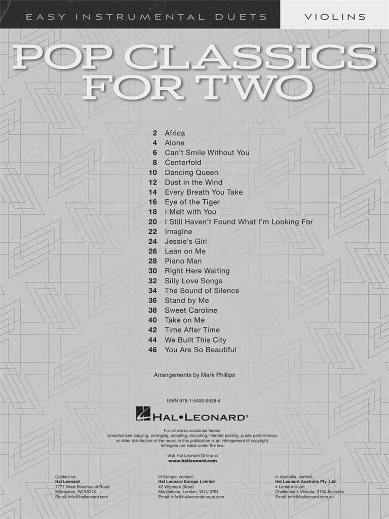 POP CLASSICS FOR TWO EASY DUETS VIOLINS iz kategorije godala komorni sestavi sodi med odlične godala.HL00303024 1. Africa 2. Time after time 3. Alone 4. Stand by Me 5. Lean On Me ...