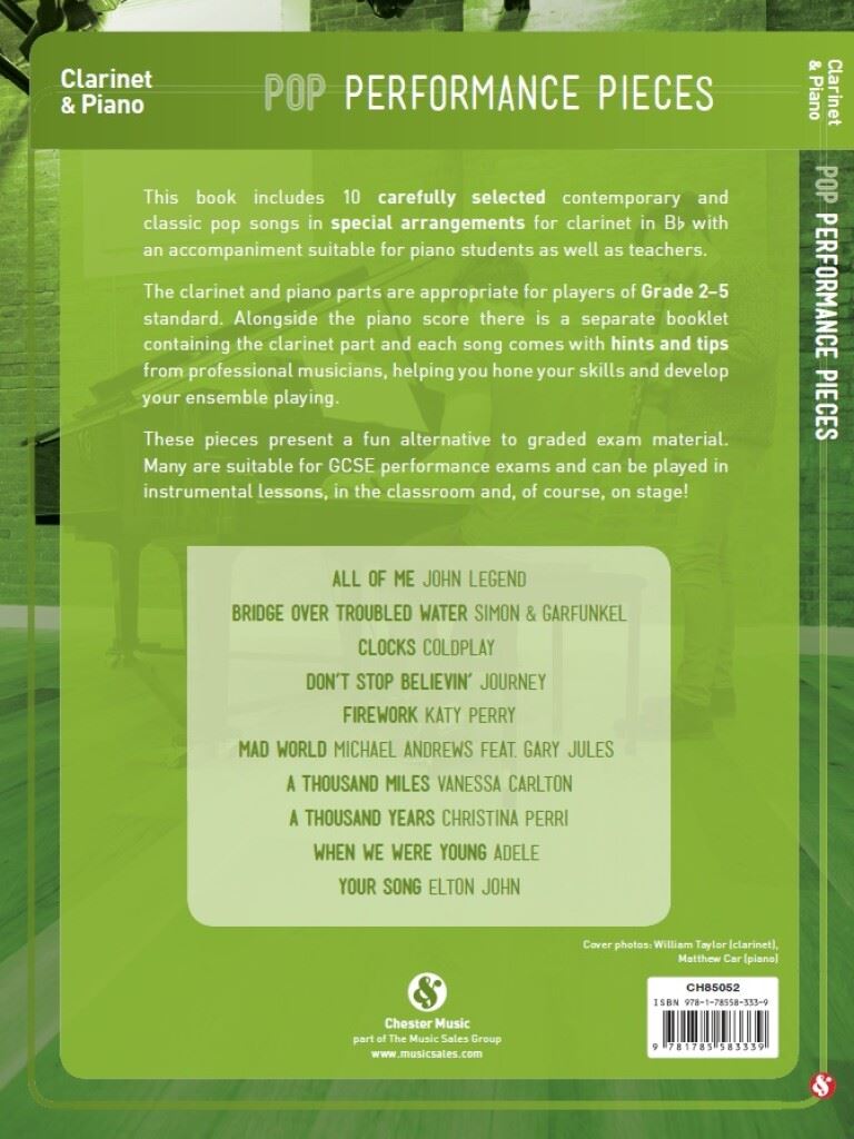 POP PERFORMANCE PIECES 10 HIT SONGS FOR CLARINET AND PIANO iz kategorije zabavna glasba sodi med odlične klarinet.CH85052 1. A thousand miles 2. A Thousand Years 3. All of Me 4. B ...