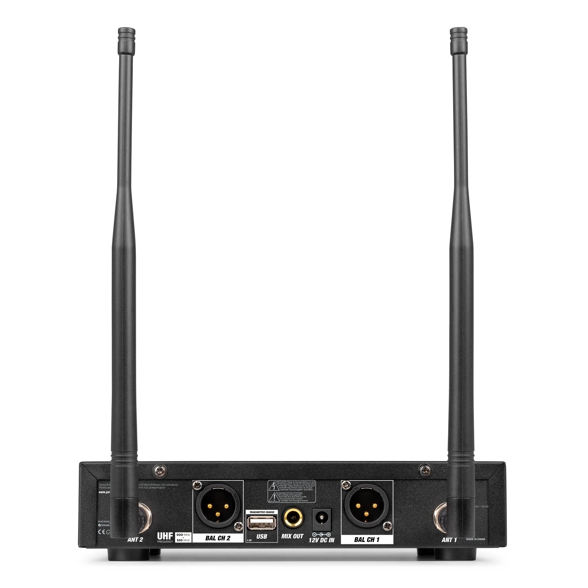 Ta komplet vsebuje 2-kanalni sprejemnik UHF, dva ročna mikrofona z litij-ionsko baterijo za ponovno polnjenje, dve odstranljivi BNC anteni, dva podaljška kabla za sprednjo montažo anten, napajalnik in aluminijasto ohišje. Priloženi so tudi USB kabli za polnjenje brezžičnih mikrofonov.