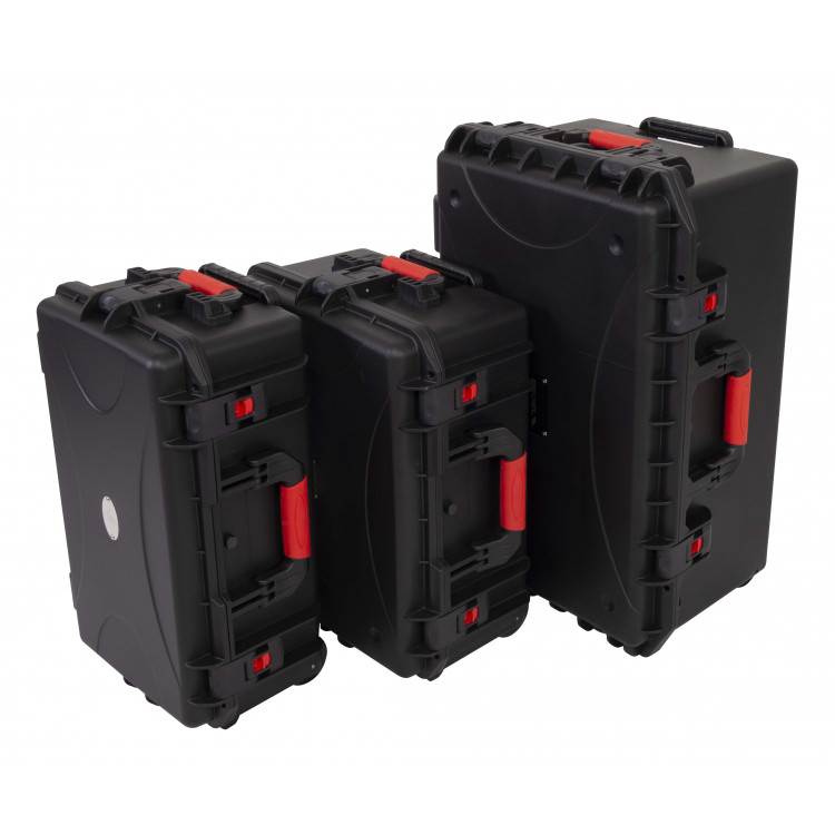 Modified polypropylene injection molded case. Equipped with practical pull retractable handle, with locking system and recessed wheels in the structure. External dimensions: W 580 mm x D 345 mm x H 230 mm / Internal dimensions: W 520 mm x D 288 mm x H 200 (150 + 50) mm.