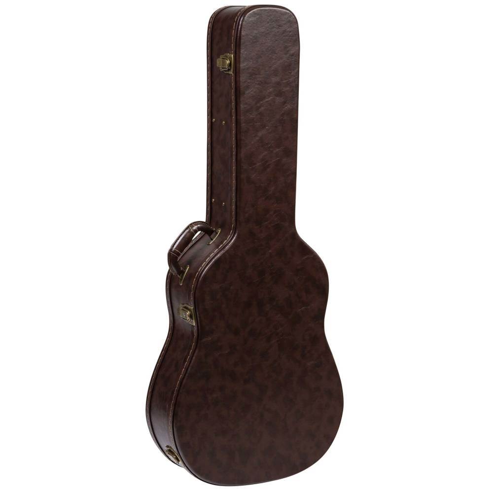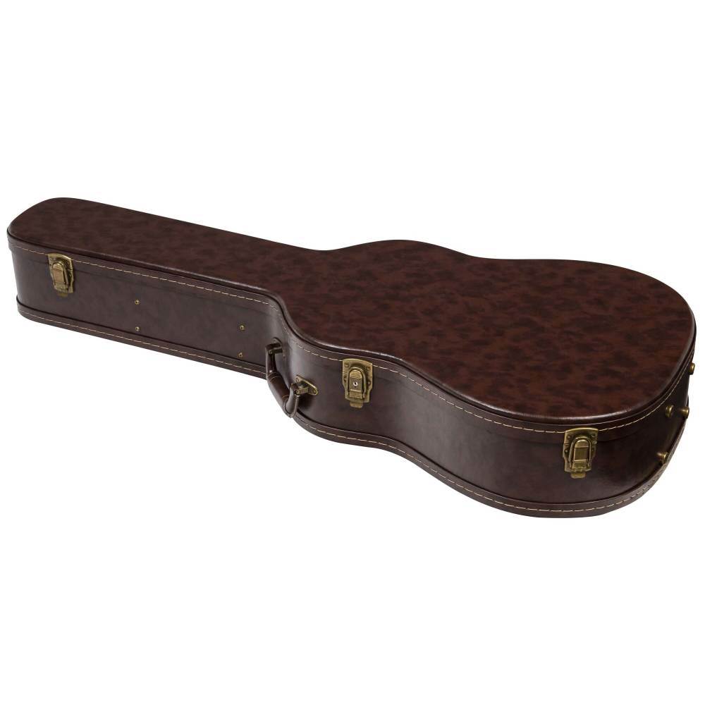 Vintage oblikovan lesen kovček za akustično/folk kitaro z zunanjo oblogo iz rjavega vinila in notranjo oblogo iz mehkega bordo žameta.