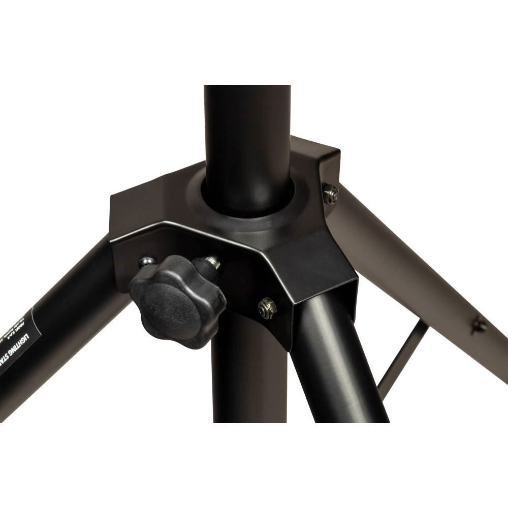 Profesionalno stojalo za svetlobne sisteme. Izdelano iz jekla z najlonskimi nastavitvenimi spoji s steklenimi vlakni in jekleno povezavo. Opremljeno z jeklenim varnostnim zatičem. Stojalo ima dva raztegljiva dela za maksimalno višino 3,40 metra in je opremljeno tudi s T-ročko s priključkom O 28 mm in kompletom vijakov za pritrditev opreme.