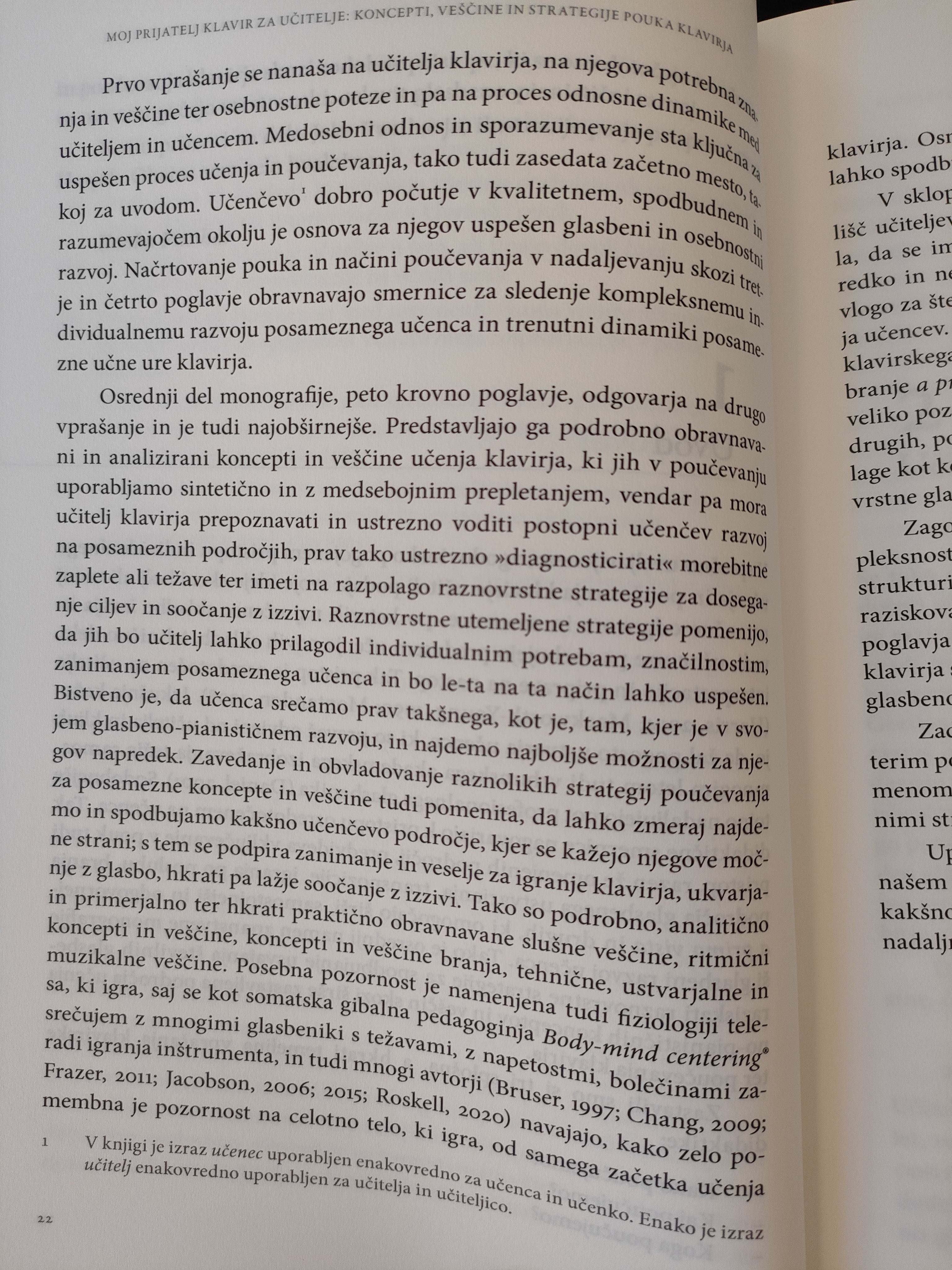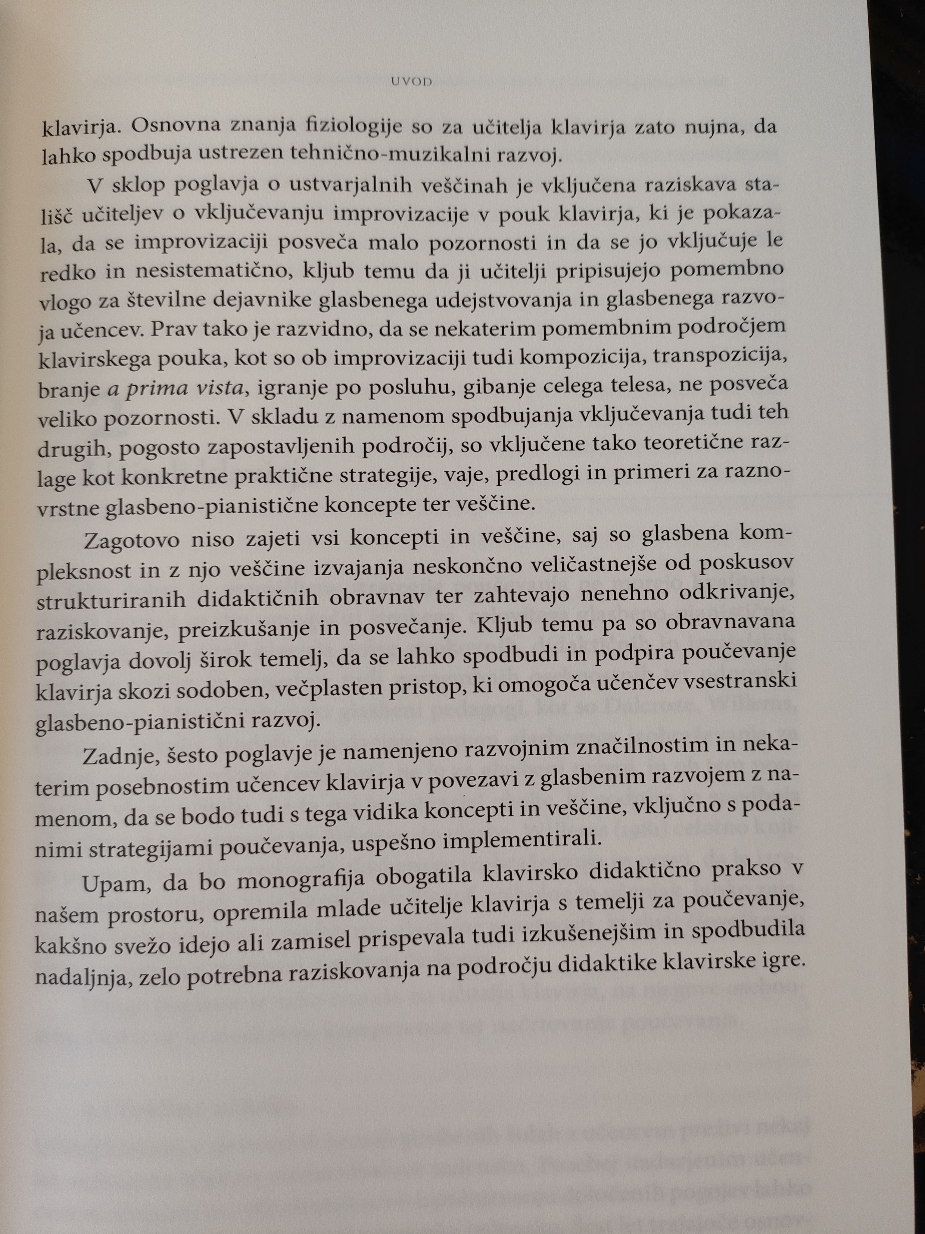 nastajalo vrsto let skozi opazovanje, preizkušanje, raziskovanje, analiziranje, primerjanje najrazličnejših didaktičnih dognanj, pristopov, idej, možnosti, vključno s svojimi lastnimi, končna realizacija pa je sledila želji, da bi študenti specialne didaktike klavirja dobili v roke slovensko knjigo s tega področja, kjer tovrstne literature ni v izobilju.