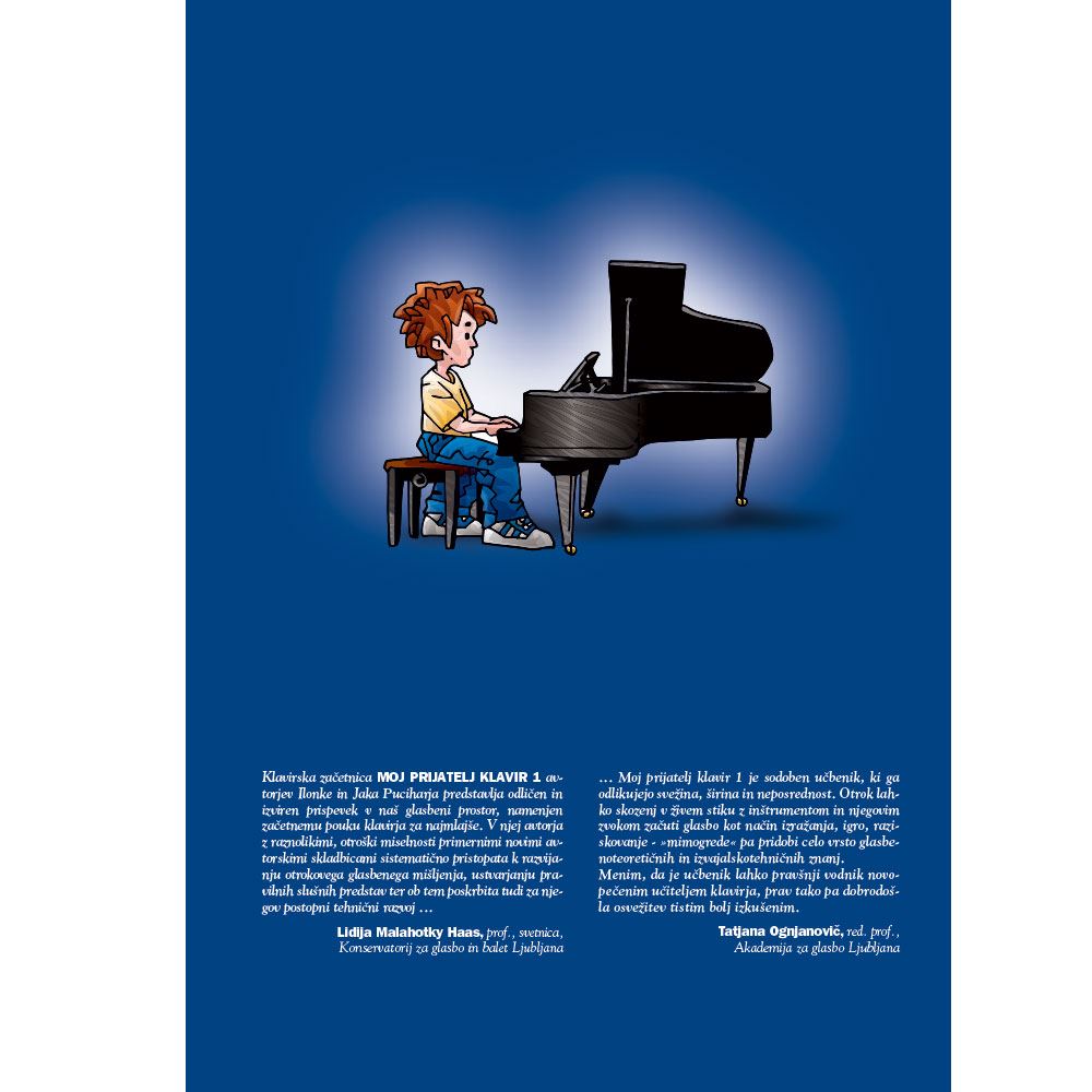 Klavirska začetnica MOJ PRIJATELJ KLAVIR 1 avtorjev Ilonke in Jaka Puciharja predstavlja odličen in izviren prispevek v naš glasbeni prostor, namenjen začetnemu pouku klavirja za najmlajše. V njej avtorja z raznolikimi, otroški miselnosti primernimi novimi avtorskimi skladbicami sistematično pristopata k razvijanju otrokovega glasbenega mišljenja, ustvarjanju pravilnih slušnih predstav ter ob tem poskrbita tudi za njegov postopni tehnični razvoj …