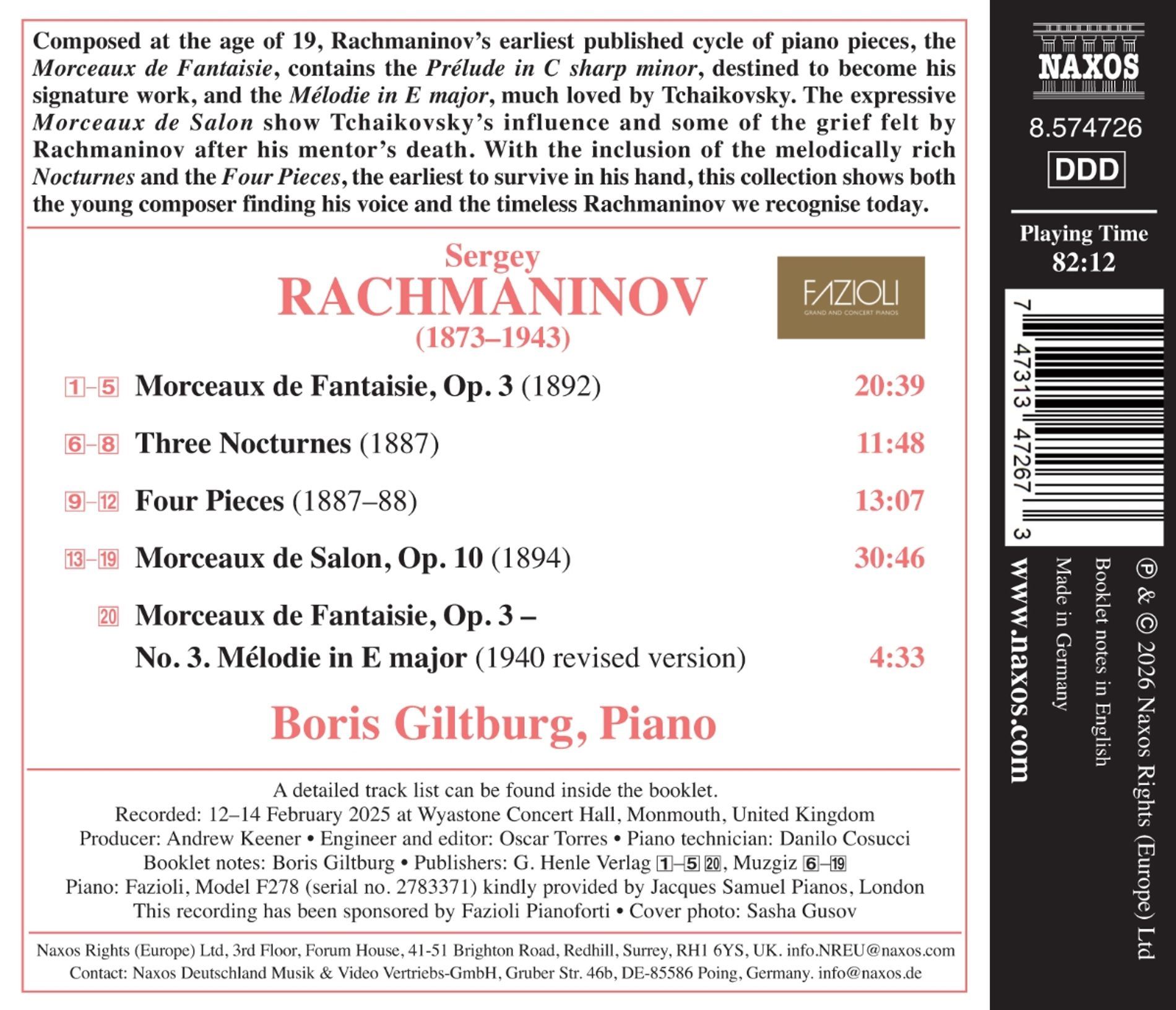 RACHMANINOV:MORCEAUX DE FANTAISIE/BORIS GILTBURG