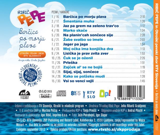 PESMI / KARAOKE 1. / 16. Barčica po morju plava 2. / 17. Šmentana muha 3. / 18. Jaz pa grem na zeleno trav'co 4. / 19. Marko skače 5. / 20. Na planin'cah sončece sije 6. / 21. Žabe ...
