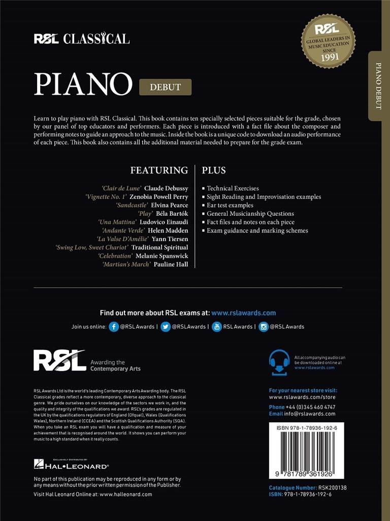 RSL CLASSICAL PIANO DEBUT (2021) iz kategorije skladbe, sodi med odlične klavir.RSK200138 Namen novega učnega načrta za klasični klavir RSL je odražati širši okus mladih, postavlj ...