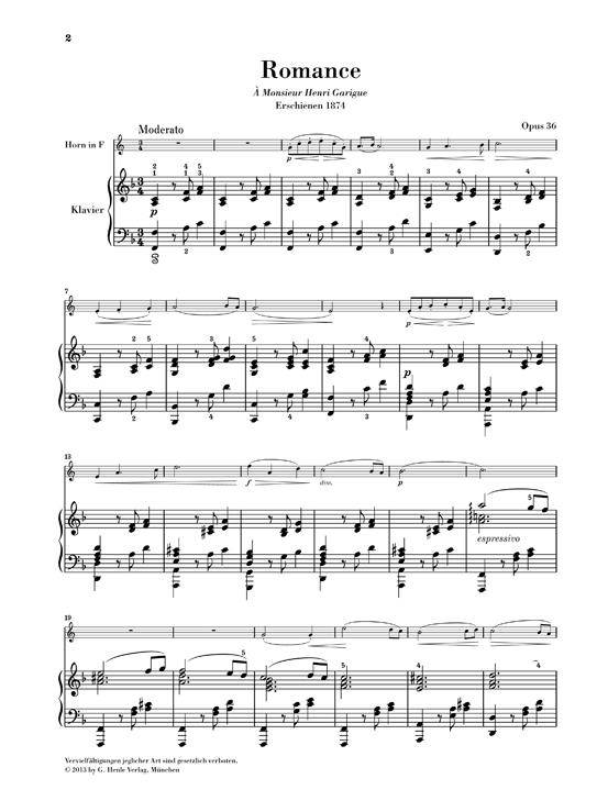 Camille Saint-Saëns je svoje dve romansi za Horn sestavil za dva najbolj cenjena francoska glasbenika tistega časa: Opus 67 v E-duru iz leta 1866 je posvečen Henriju Chaussierju - Opus 36 v F-duru iz leta 1874 je bil napisan za Henrija Garigueja. Kljub slavnim prejemnikom niso virtuozne razstave, ampak - kot navaja izraz Romance - kratke pesmi brez besed, ki v celoti uživajo v tipičnem romantičnem zvoku roga. Saint-Saëns je poleg orkestrske različice pripravil tudi klavirsko spremljavo za nastope v komorni glasbi. Ker niso tehnično preveč zahtevni, so romance primerne tudi za napredne študente.