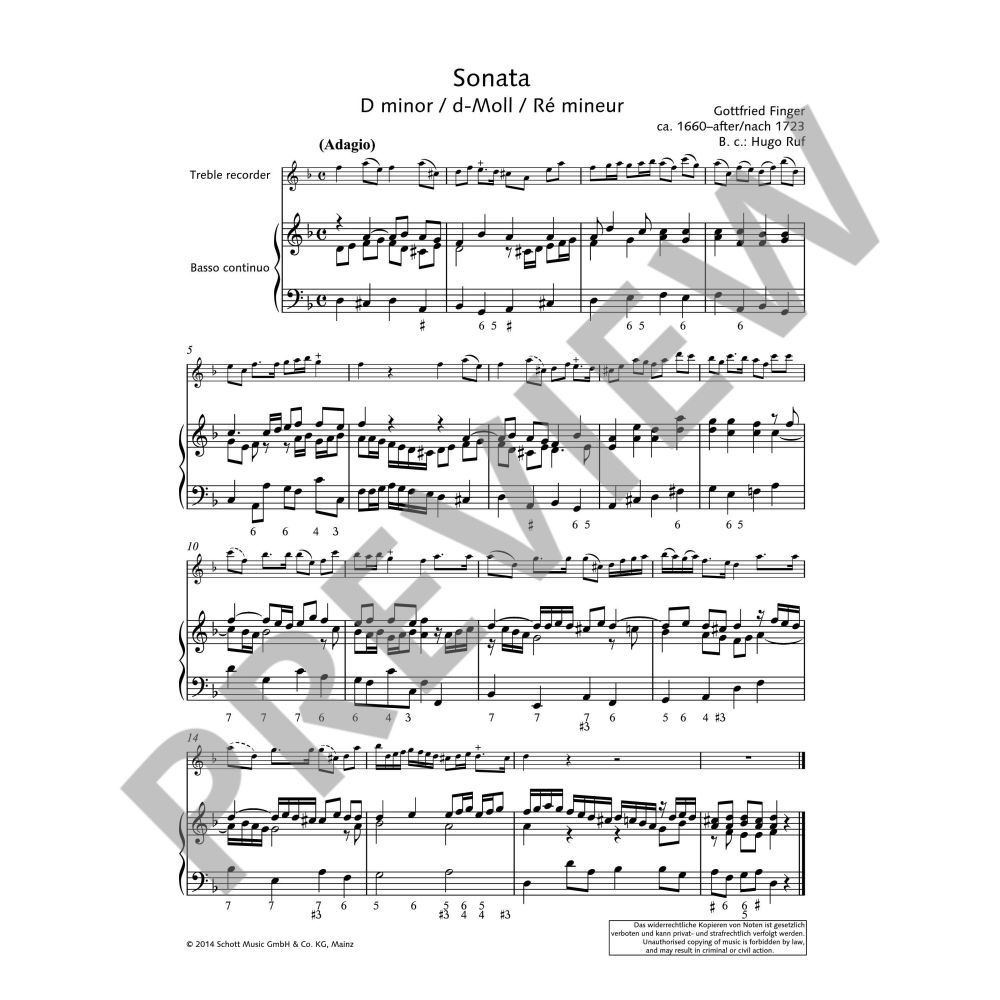 SCHOTT RECORDER LIBRARY THE FINEST SONATAS FOT TREBLE RECORDER AND BC. iz kategorije skladbe sodi med odlične kljunasta flavta.ED21788 G. Finger: Sonata D minor (Adagio), Allegro, ...