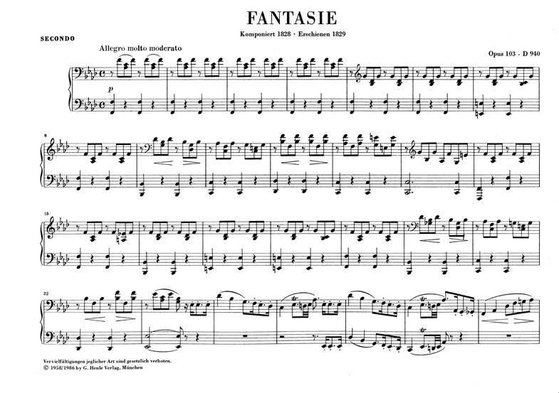 Noben velik skladatelj ni pustil toliko del za klavirski duet kot Franz Schubert. Ustvarjanje glasbe z drugimi, pogosto v družabnem krogu, je bila trdna sestavina Schubertovskega kroga prijateljev. S Fantasie v f-molu D 940 op. objava. 103 pa je Schubert popolnoma zapustil sfero družabnih srečanj in v prvih mesecih svojega zadnjega leta življenja ustvaril delo skoraj simfonične oblike, katerega elegično vzdušje na začetku daje ton celotnemu delu. Schubert se je očitno zavedal pomena dela in ga pripravil za tisk: avtogram je že imel v njegovi roki številko opusa prve izdaje, objavljene marca 1829.