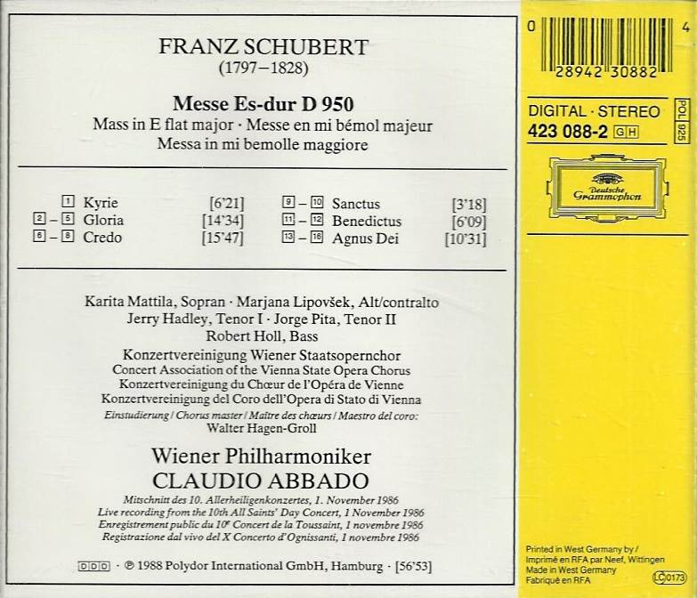 SCHUBERT:MESS ES-DUR D950/LIPOVŠEK/HADLEY/ABBADO iz kategorije klasika in slovenska narodna sodi med odlične cd.