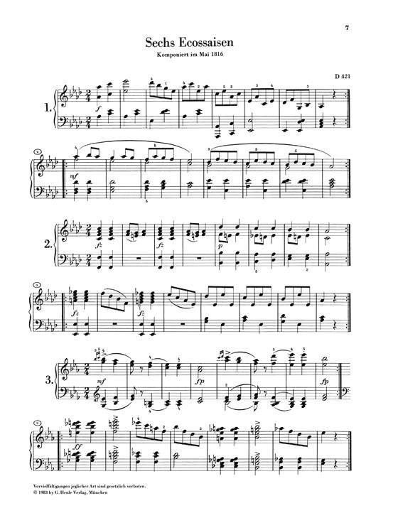 Schubert za klavirjem s svojim neizčrpnim bogastvom plesnih melodij, prijatelji okoli njega plešejo in igrajo šale - to je ena od tradicionalnih Schubertovih podob, ki jo tako cenimo. Izraz Schubertiade, izumljen za tovrstno druženje, je zdaj trdno uveljavljen. Ta zvezek vsebuje več kot 200 plesov, minuetov, valčkov (vključno s slavnimi 34 Valses sentimentales op. 50 in 12 Valses plemičev op. 77), ländler, écossaises, nemški plesi - vsak lepši od naslednjega. Napisani so bili v letih 1816-1826. V Dodatku lahko najdemo še 32 plesov, od katerih se prenašajo samo melodije ali pa so bili prvotno najverjetneje namenjeni drugim žanrom ( HN 74).