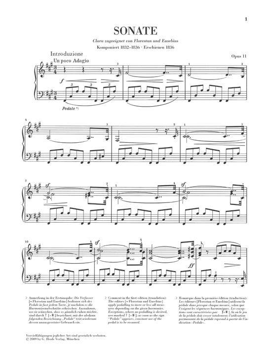 Po Schumannovem prvem, očitno neuspelem poskusu sestave "Sonate" - uvodni stavek je dal objaviti šele pod naslovom "Allegro v b-molu" - je poskusil še enkrat leta 1833. Znano dejstvo je, da je bila ta sonata sestavil, medtem ko je bil v tesnem stiku s Claro Wieck, ki je bila takrat trinajst let. Posamezne motive iz nje najdemo kasneje v Klarinem delu - toda na enak način lahko v sonati najdemo posamezne figure, ki kažejo na Klarin op. "Pieces caractéristiques". 5. Poleg tega je Schumann za drugi stavek uporabil skoraj dobesedno priredbo svoje pesmi "To Anna". To smo vključili v dodatek k naši izdaji in s tem pokazali korenine te skladbe.