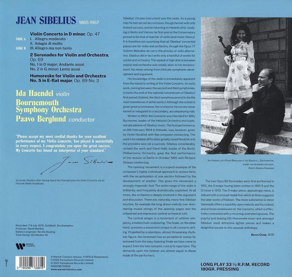 SIBELIUS:VIOLIN CONCERTO,TWO SERENADES,HUMORESKE NO.5/IDA HAENDEL iz kategorije lp sodi med odlične Nosilci zvoka in slike.
