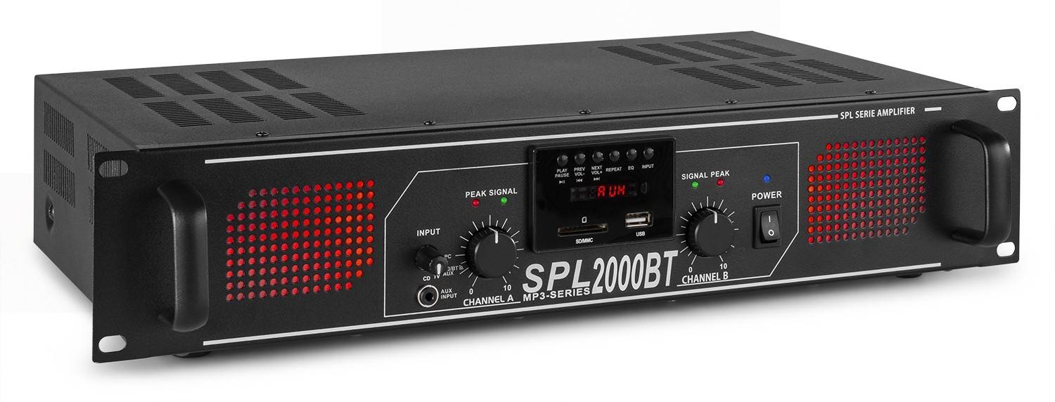 SKYTEC OJAČEVALEC SPL 2000BTMP3 Amplifier Red LED + EQ Black iz kategorije ojačevalniki sodi med odlične Ozvočenja. SPL 2000W amplifier Bluetooth receiver for streaming au ...