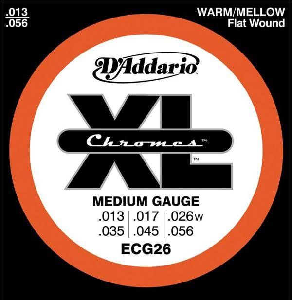 ECG26 is D'Addario's heaviest gauge of flat wounds. This set delivers smooth feel, warm/mellow tone and maximum tension. XL Chromes are noted for their smooth feel and warm, mellow tone, essential to the sound and style of many jazz, blues, and rock players.