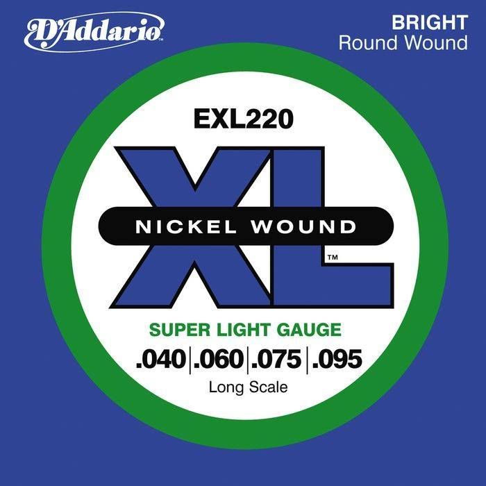Strune D'Addario EXL 220 za električno bas kitaro imajo razločen, poln zvok ter odlično intonacijo. Komplet štirih strun EXL220 Super soft gauge, Long: ovj iz niklja; 040, 060, 075, 095.