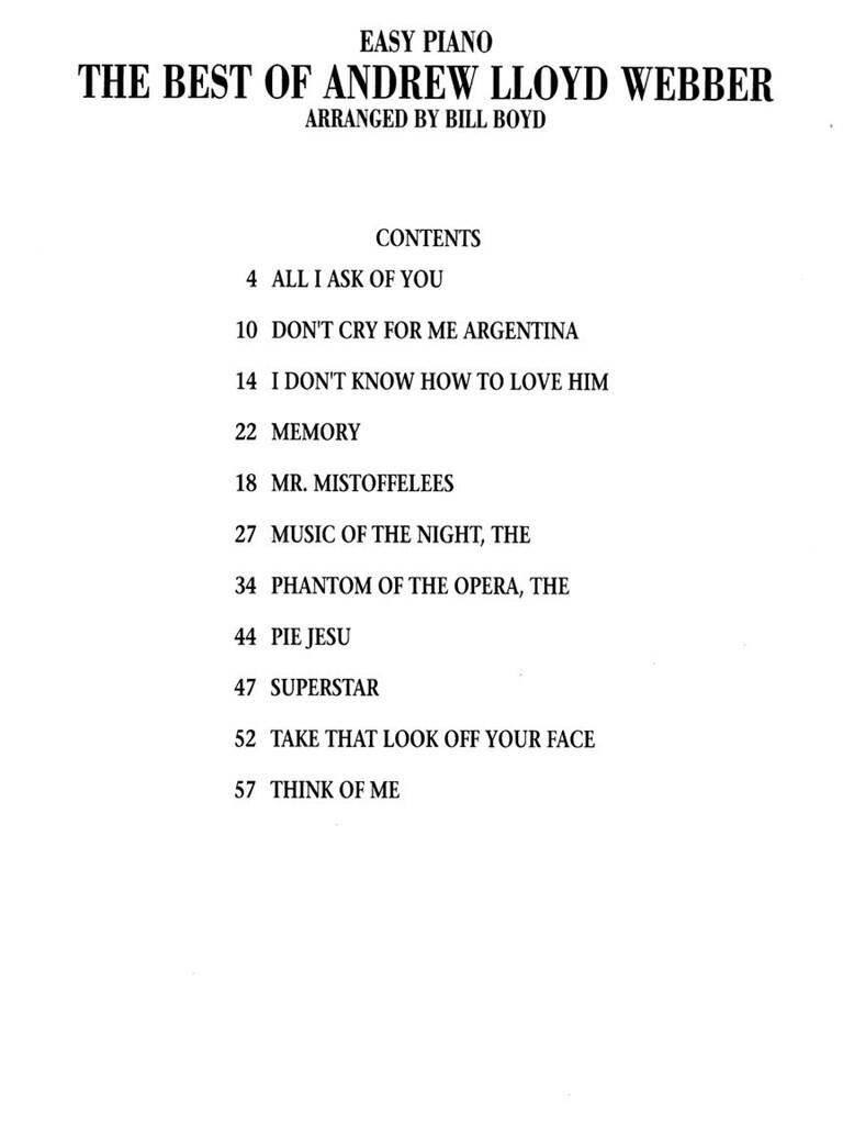 THE BEST OF ANDREW LLOYD WEBBER EASY PIANO iz kategorije zabavna glasba sodi med odlične klavir.HL00290333 1. Memory 2. All I Ask Of You 3. Superstar 4. Don'T Cry For Me Argentina ...