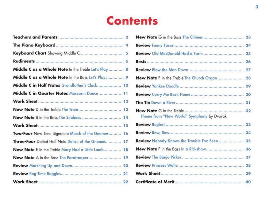 a tečaj je zasnovan tako, da predstavi najlažji možen pristop k igranju klavirja, skupaj z zabavno družino likov in ilustracijami, ki pomagajo poudariti poučevane informacije. Prvi del je namenjen razvijanju tekočega branja z notami, največjo oviro za večino majhnih otrok. Obseg je namenoma omejen. Predstavljenih je le pet zapiskov navzgor in pet zapiskov navzdol od sredine C, časovne vrednosti pa ne presegajo kvačkanj.