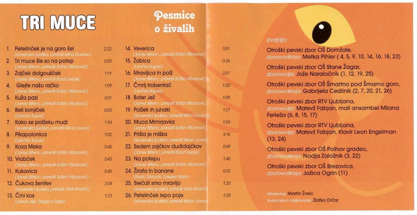 TRI MUCE - PESMICE O ŽIVALIH iz kategorije otroški sodi med odlične cd.Podrobnosti CD s 26 otroškimi pesmicami. Nekaj je ljudskih, največ pa od znanega slovenskega pisca otroških ...