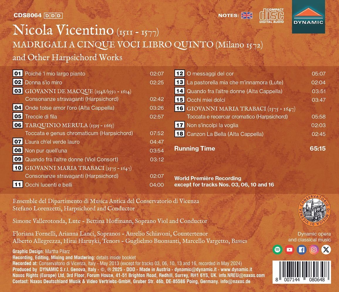 VICENTINO:MADRIGALI A CINQUE VOCI LIBRO QUINTO iz kategorije klasika in slovenska narodna sodi med odlične cd.