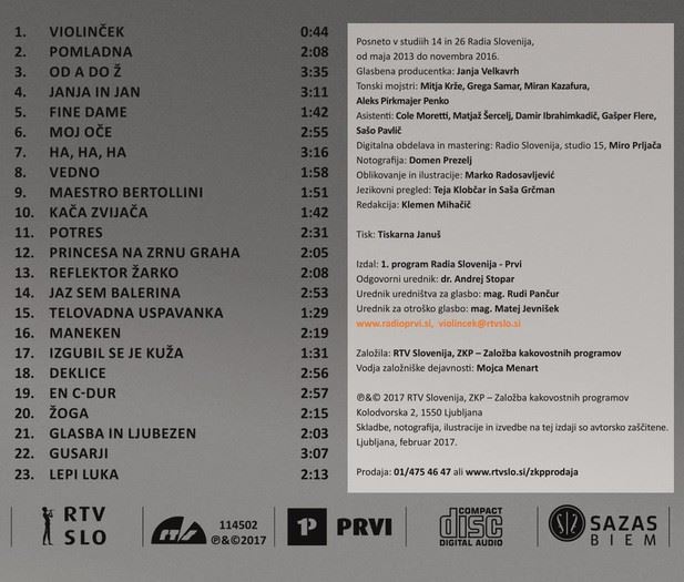 VIOLINČEK 4 23 OTROŠKIH PESMI+PESMARICA+INSTRUMENTALI iz kategorije otroški sodi med odlične cd. PESMI 1. VIOLINČEK 0:44 (Rudi Pančur/Milan Dekleva/Rudi Pančur) 2. POMLADNA 2:08 ( ...
